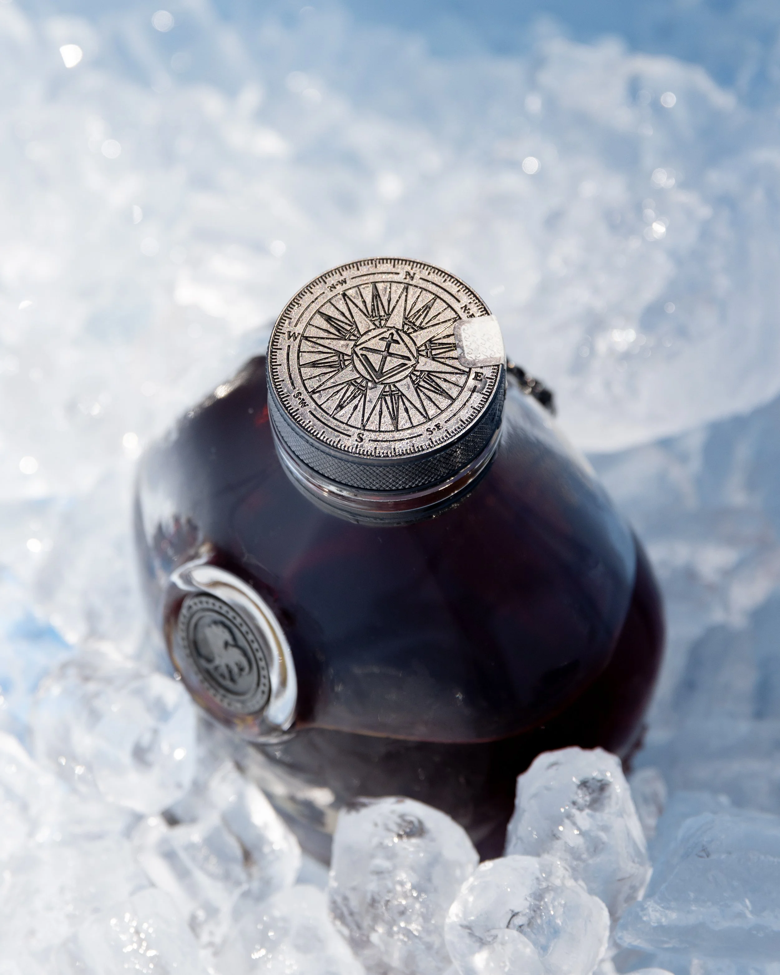 A glass bottle of dark liquid, possibly soda or syrup, is placed on ice in a snowy outdoor setting. The bottle has a metal cap with a compass design etched on it.