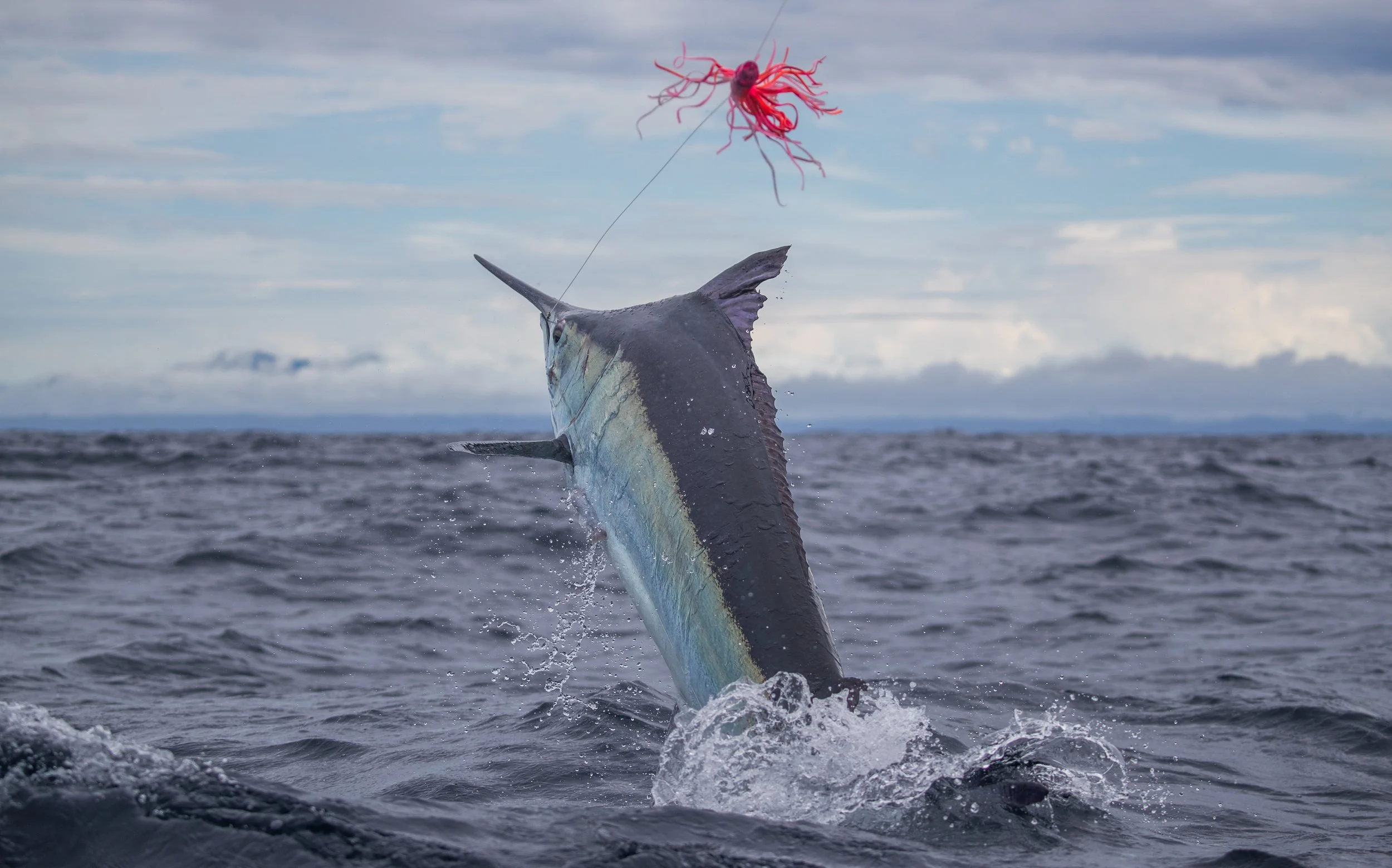 A marlin jumping out of the water with a fishing lure attached to its mouth.