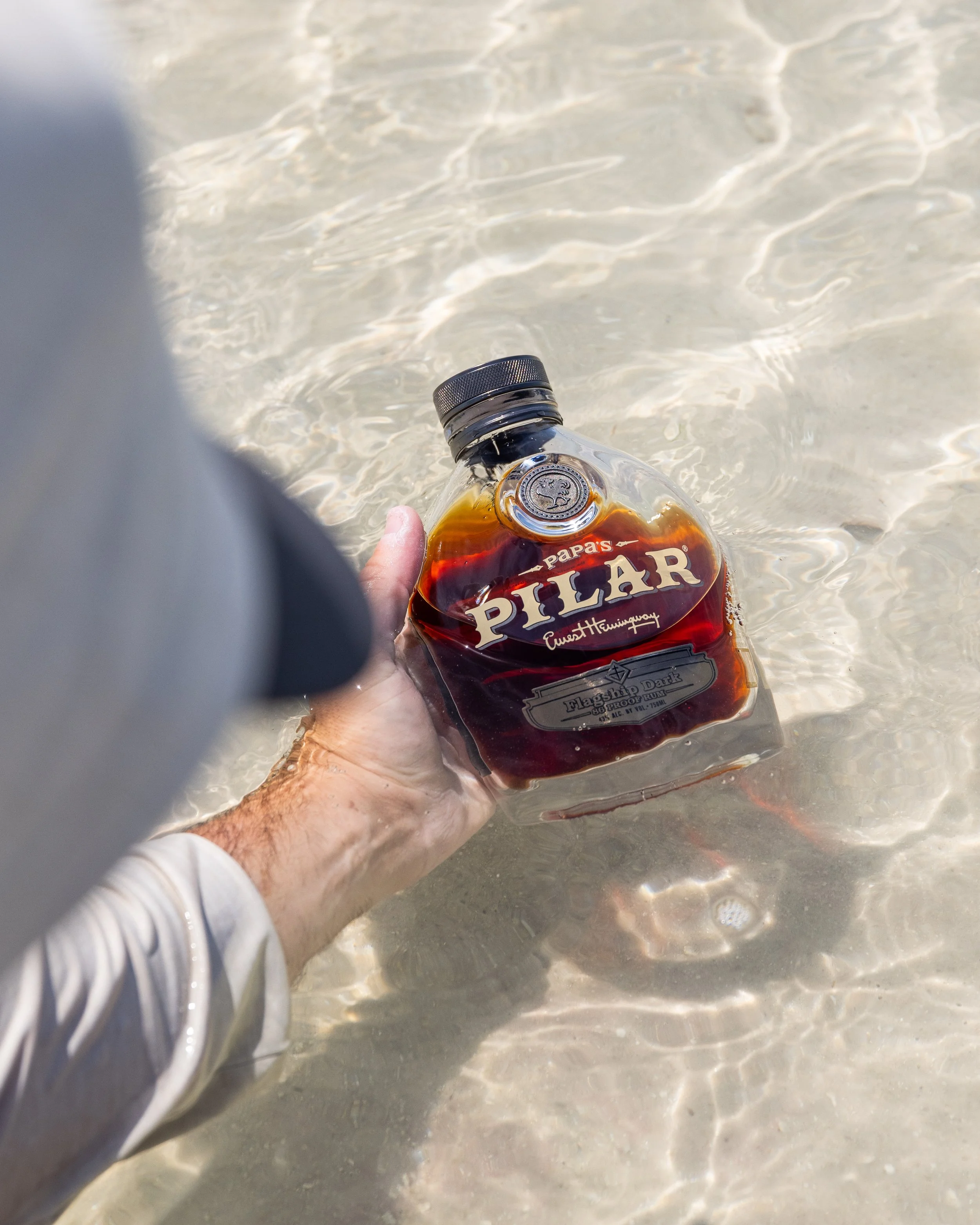 A person's hand holding a bottle of Pilár Papa's whiskey in shallow water at the beach.