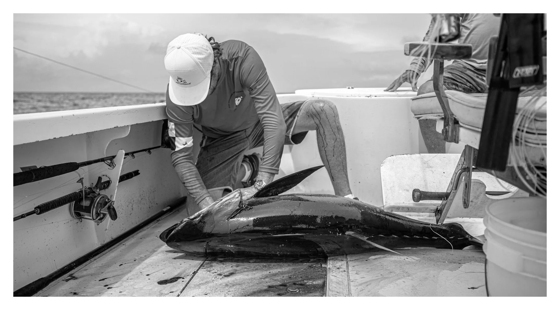 Person placing a large fish, possibly a marlin, on a boat deck after a catch, with fishing rods and equipment visible.
