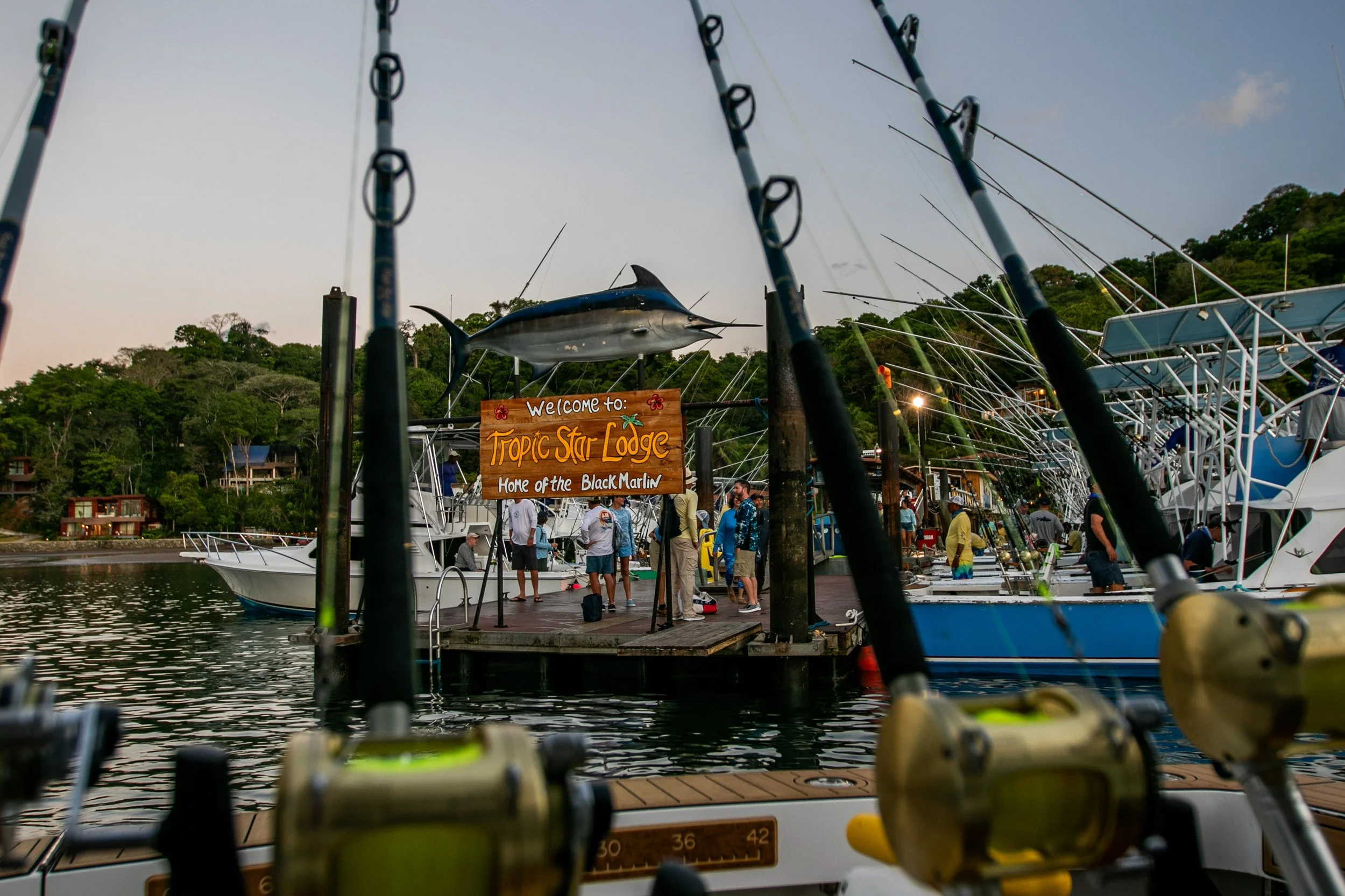 View of a marina with boats and fishing rods, a sign that reads 'Welcome to Topic Star Lodge, Home of the Black Marlin,' and people preparing for fishing on a dock with a scenic hillside in the background.